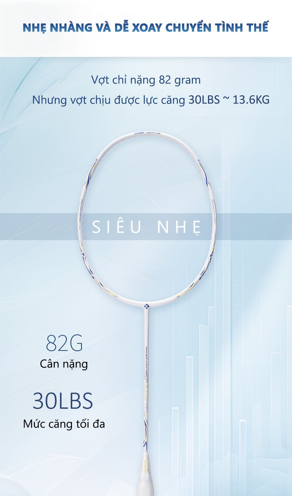 – Sức căng dây tối đa lên đến 30lbs ~13.6kg: Khung vợt tiêu chuẩn với độ cứng vừa phải và nổi bật về sự đàn hồi trợ lực, phù hợp với mọi người chơi từ bắt đầu đến chuyên nghiệp.