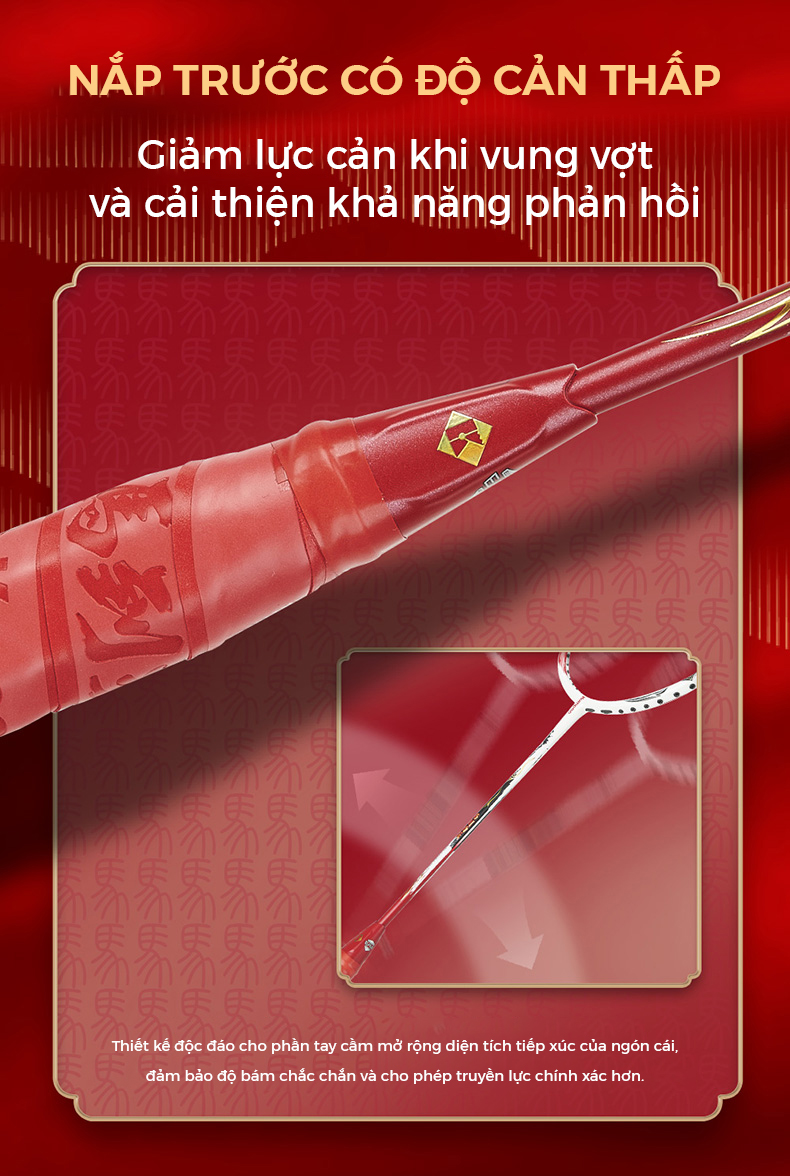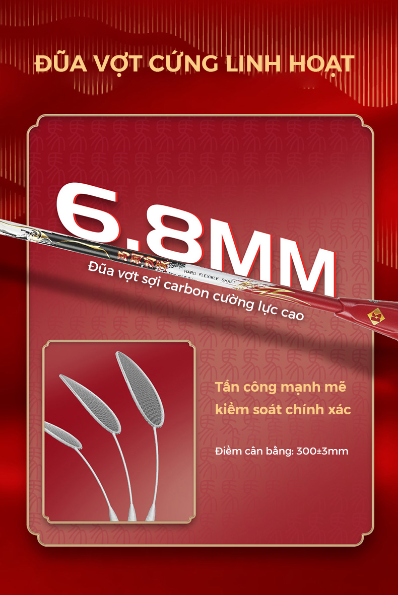 – Đũa vợt đường kính 6.8mm, cứng linh hoạt, truyền lực tốt, cho cảm giác đánh chắc tay