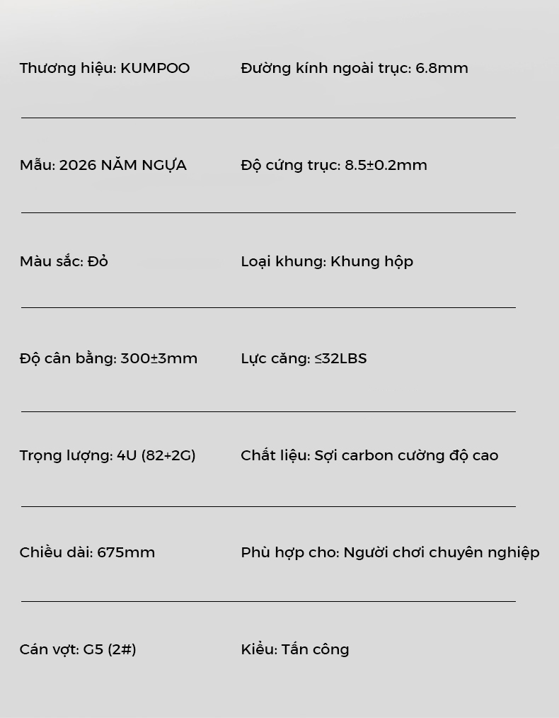 – Set vợt cầu lông Kumpoo Year of Horse linh vật Ngựa Lửa Tết Bính Ngọ 2026 phù hợp với người chơi thiên công với những pha cầu mạnh mẽ, đầy sức mạnh