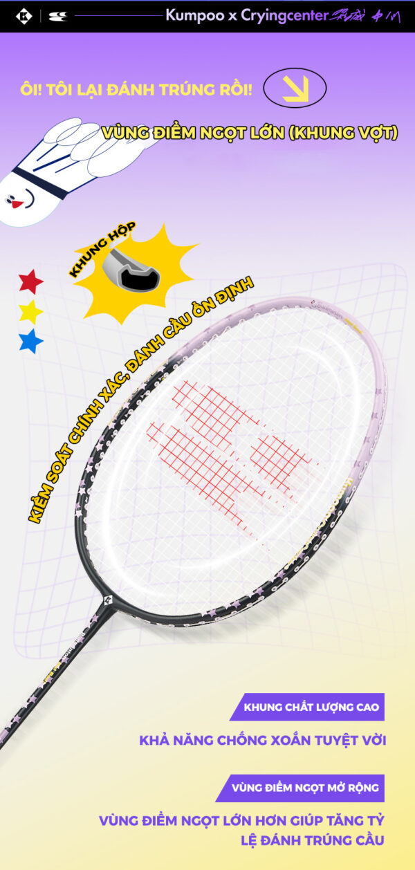 – Higher hit rate: Cấu tạo mặt khung trên cây vợt đánh cầu lông Kumpoo Crying Center chính hãng khá chuẩn tạo điểm ngọt lớn làm tăng âm thanh khi tiếp cầu, tạo sự phấn khích cho người chơi.