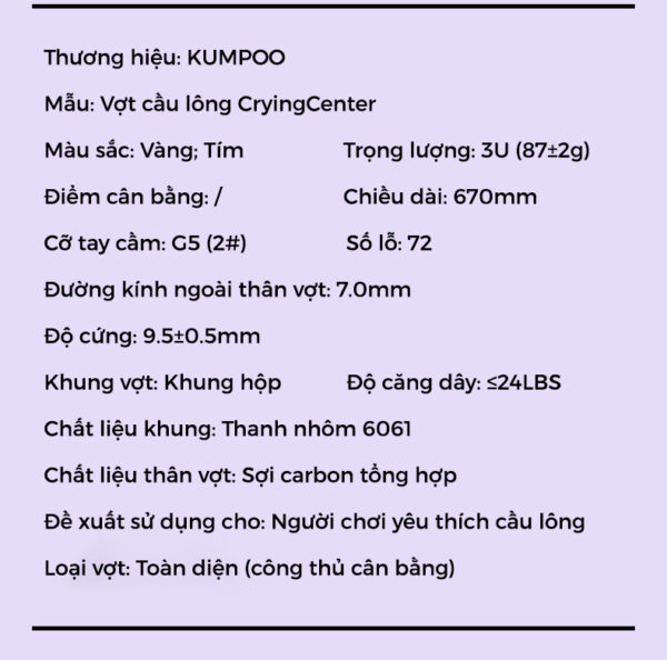 – Vợt cầu lông Kumpoo Crying Center chính hãng phù hợp cho người có lực cổ tay yếu trung bình, người chơi cầu lông phong trào tầm trung.